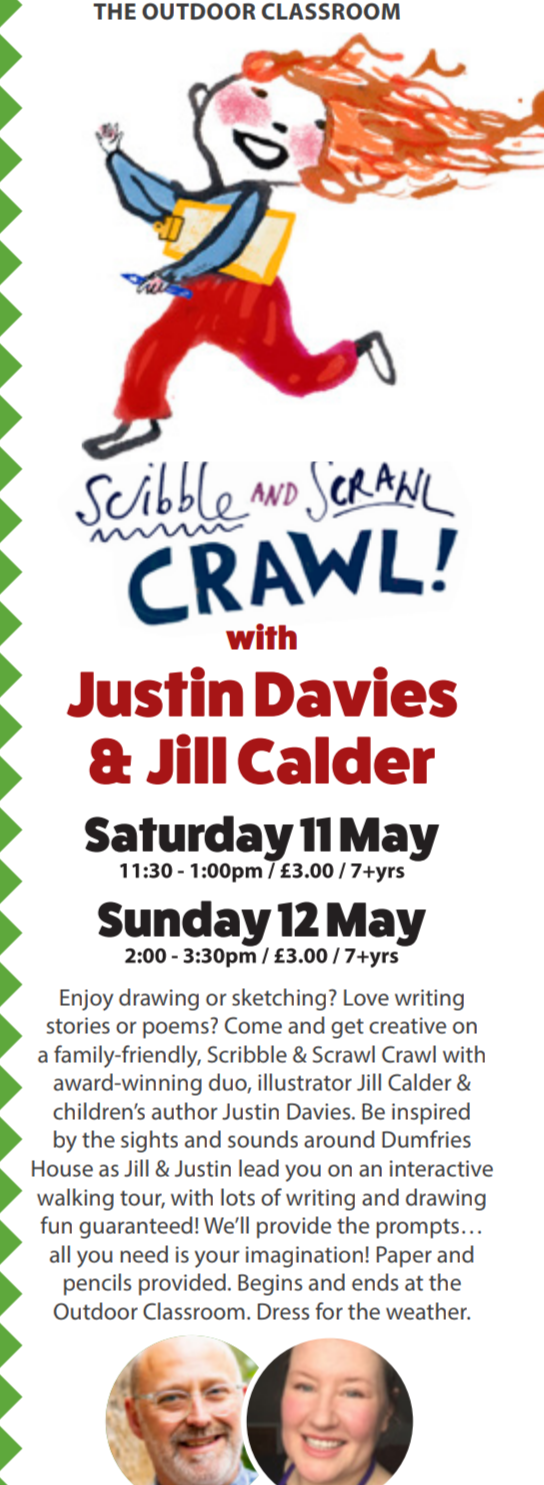 I’m thrilled to be appearing with fabulous illustrator, Jill Calder, for one of our always popular Scribble & Scrawl Crawls. Come and join us for a creative walking tour of the Borders Book Festival site. Sunday, June 16th, 3.15pm